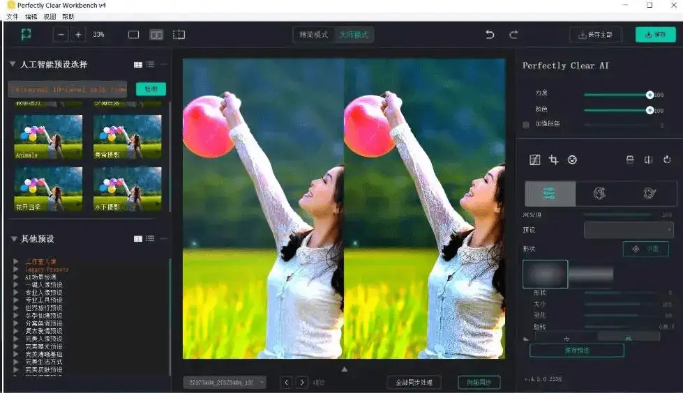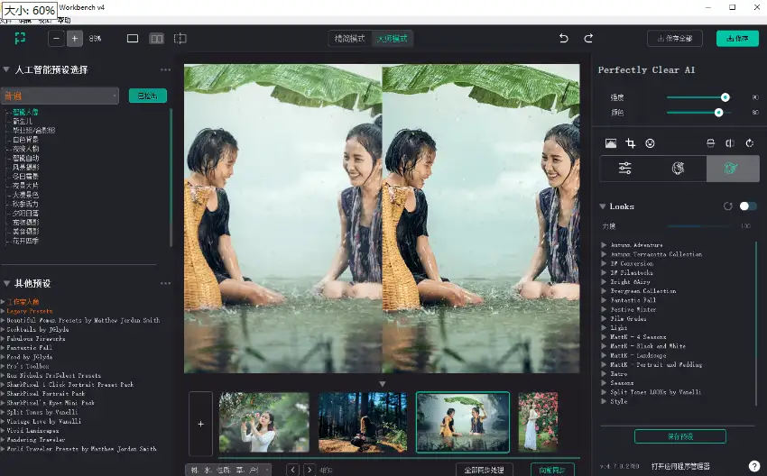 - 内置 100 + 中文定制预设:涵盖 “日系小清新”“电影感胶片”“古风工笔画” 等热门风格,每个预设附带参数说明(如高光 + 15 / 阴影 – 10 / 色温 + 5),小白也能看懂专业调色逻辑