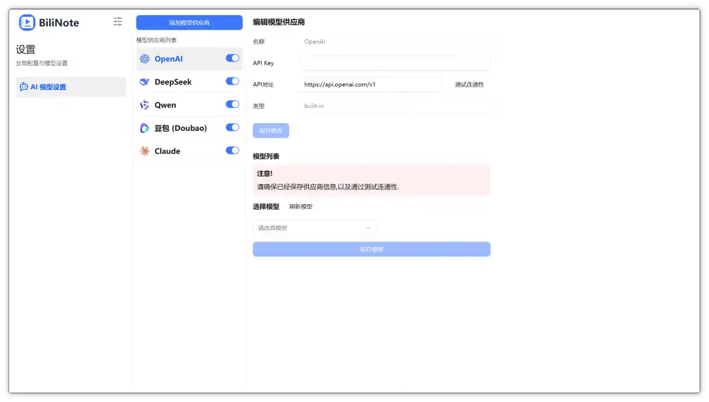 - 接入 OpenAI / DeepSeek / 通义千问 多模型支持。添加APi即可使用
