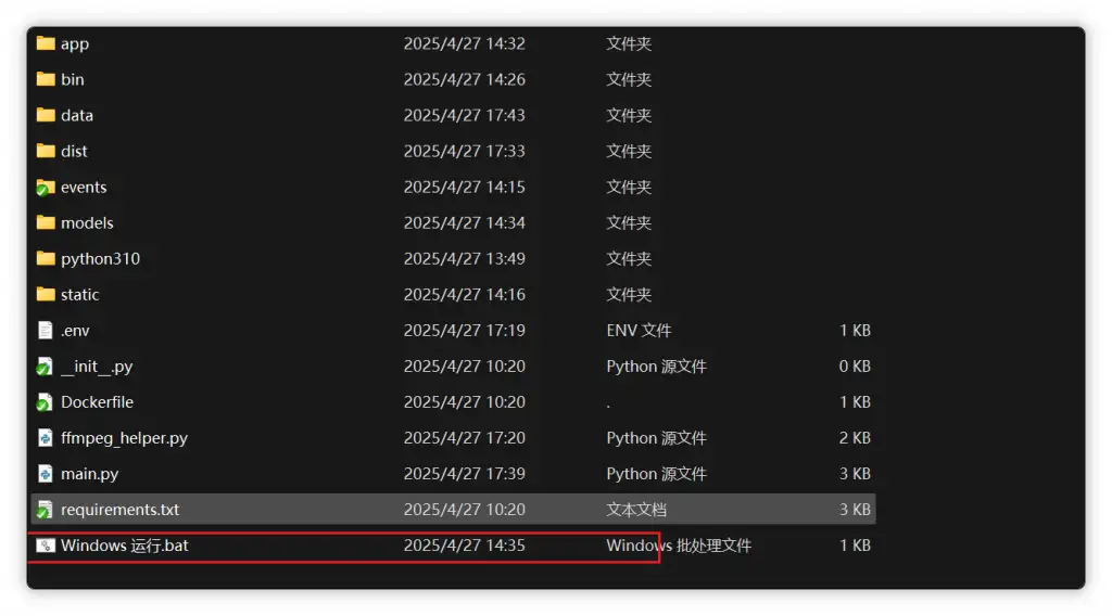 在软件文件夹中找到并双击运行 Windows 运行.bat 文件。这将启动BiliNote桌面端。