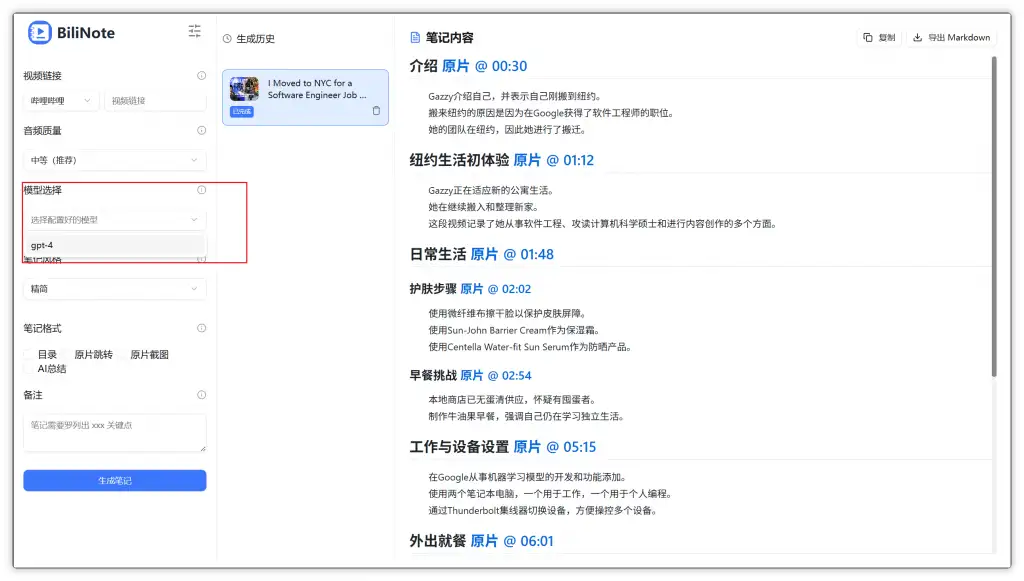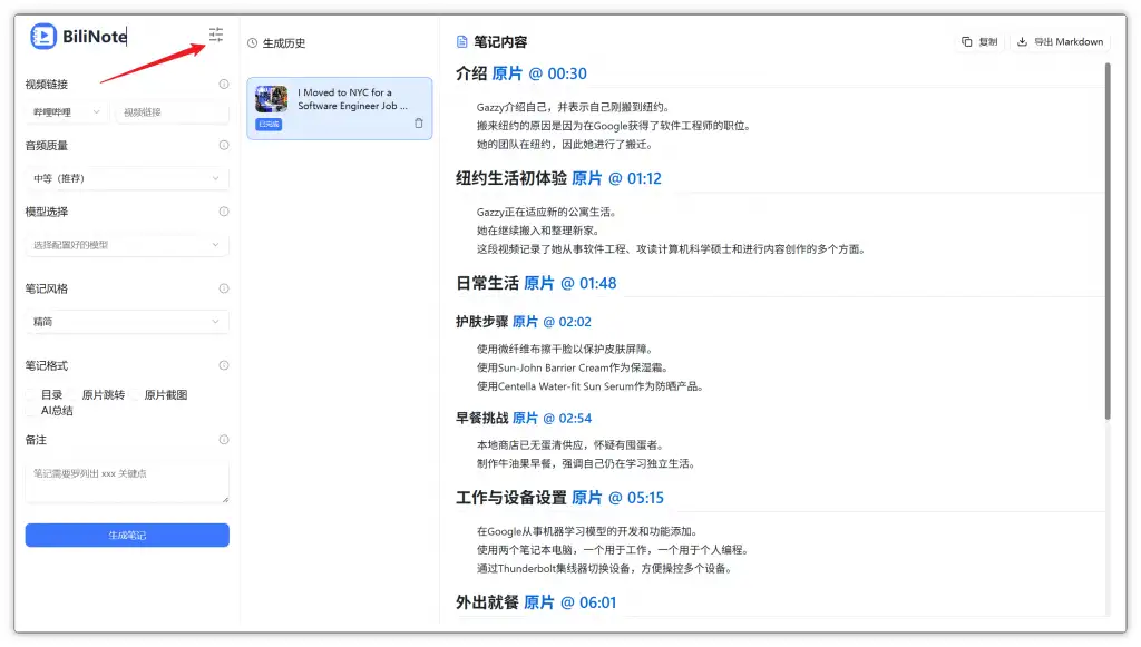 - Markdown 格式笔记输出,适配博客和阅读场景,及各种风格文案生成