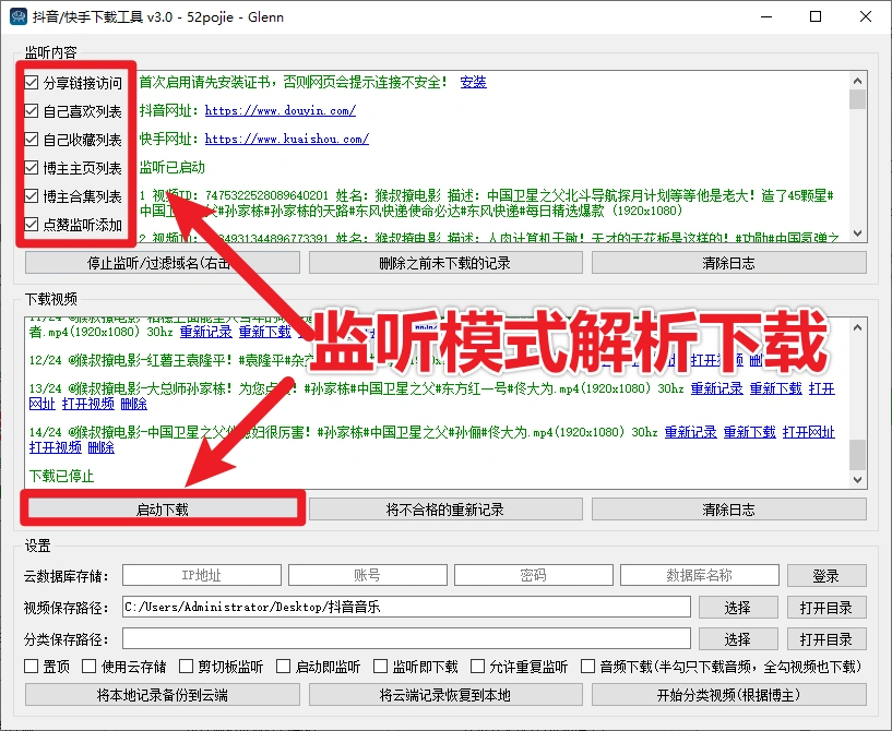- 我们是以监听的形式进行下载,把前面的选项勾选,然后点【启动监听/过滤域名】,软件就开启了监听模式。能监听分享链接、喜欢列表、收藏列表、博主主页、博主合集、点赞等等。
